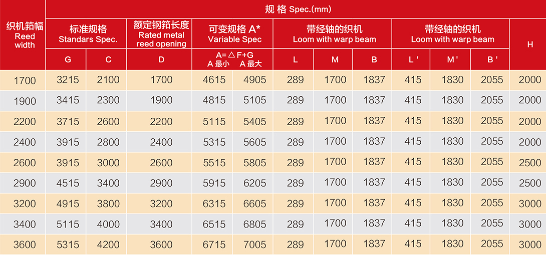 該機設計轉速700轉/分,最大入緯率1300米/分,筘幅范圍170~360厘米,不僅可織造各種服裝、裝飾面料,而且可織造輕型和中重型工業(yè)纖維和玻璃纖維。
